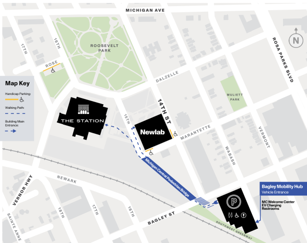 Michigan Central is located within a dense residential area. All guests, visitors, and attendees of both The Station and Newlab are asked to park at The Bagley Mobility Hub, located just across Bagley Street, at 1501 Wabash St., to ensure the lightest impact on our neighbors. Parking regulations on side streets are strictly enforced by the City of Detroit.